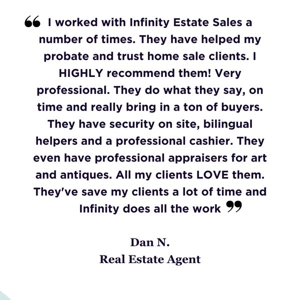 Yes, we can. One of the owners of Infinity Estate Sales, Gary Lawrence, is an award-winning California Licensed Realtor (DRE#02220961), he personally handles all real estate transactions for our clients, offering a personalized touch to each interaction. Gary is a Certified Probate & Trust Specialist by the California Association of Realtors.